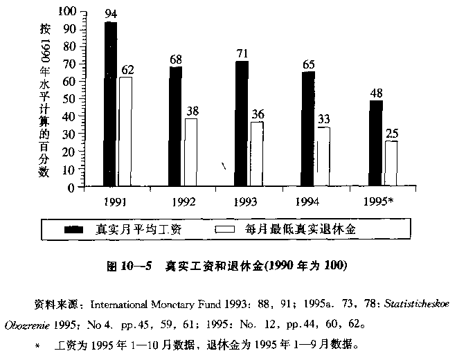 养老金领取者实际收入的下降比工薪阶层更甚。最低水平的养老金持续下降,1995年只有1990年的25%,实际平均养老金(不是图10—5所示的数值)也比实际工资水平下降得更快,1995年前9个月的平均实际养老金下降到1990年的43%。[16]