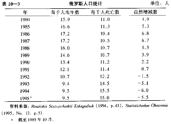 在俄罗斯,最麻烦的统计也许是人口的统计。表10—3列出了俄罗斯每千人中的出生、死亡以及自然增长率。一个国家中有各种各样的因素影响出生率或死亡率的上升或下降,这些因素中有些是无害的,如人口年龄结构的变化、拥有更好的控制生育的手段等,但在俄罗斯,突发性的出生率或死亡率的变化明显地是由于社会和经济的巨大变化所致。