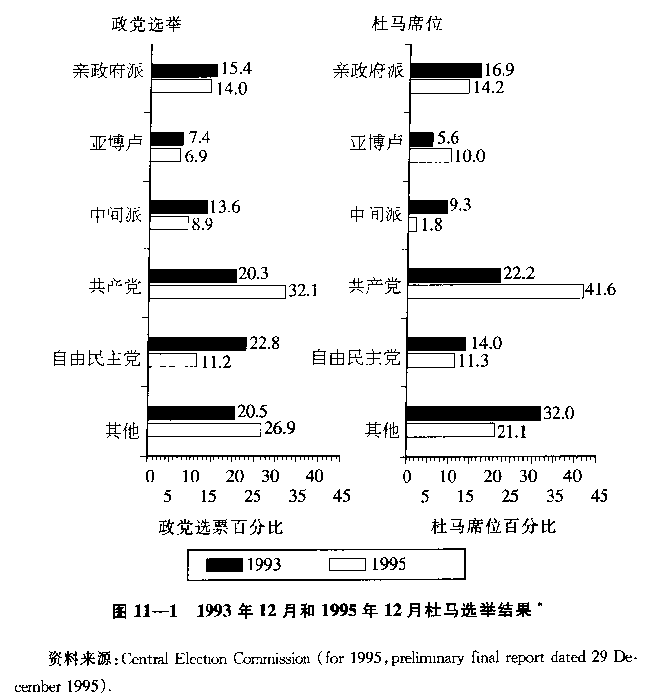 在1995年12月的选举中,“我们的家园—俄罗斯”出巨资为其在电视上做广告,日里诺夫斯基提出了新的夸夸其谈的言辞,媒体则继续报导中间派的俄罗斯社团大会可能的强有力表现,共产党几乎没花什么钱,而主要依靠他们广泛的组织来散播他们的消息,结果,共产党取得了巨大的胜利,在政党选举中,仅他们自己就获得了22.3%的政党选票和34.9%的席位,正如表11—1所示,由于将其两个亲密同盟与更激进的共产党相联合,共产党赢得了近1/3的政党选票和超过40%的杜马席位。当选举之后官方杜马机构成立的时候,俄共与其由农民党和人民权力党联合组成的盟友一起,共有221位代表,正好比450个代表的多数差5个人。[35]