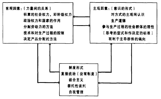 然而,这种次序排列也有问题。各种方式并不是一个接一个地按顺序、分系列出现的。这里列举的每一个方式都与其他方式同时并存,并随着时间的推移而逐渐变化。有些方式,如资本主义时代之前的农民—领主型的生产或早期资本主义的企业劳力市场,曾一度占据主导地位,但在后来的结构中却变为从属的方式。这样的方式会进行调整,以适应自己在社会结构中地位的改变。另外,有些方式分化为残余的和新生的两部分。残余的部分还保存着旧结构的特点,新生的部分则与新的结构更加一致。没有工会的小型企业保留了企业劳力市场这种方式的残余部分,而大企业使用半熟练的移民劳工的做法则是它的新生形式,这种形式在欧洲的汽车工业中相当普遍。在一些情况中,有一种似乎是清楚明确的方式,但社会背景却与这种方式起源的社会背景完全不同,因此只能说它类似一种方式,本身不是真正的方式。比如说,美国大城市中的穷人与第三世界处于边缘地位的城市人口,或与马克思和恩格斯所观察到的19世纪中期英国的“劳动力预备大军”有很多相似之处。然而,他们身处美国的政治和制度环境之中,由于环境的影响,他们充其量只能算是与第三世界的原始劳力市场的方式相类似。另一个例子是在再分配型的中央计划经济中,个体经营和小企业仍然幸存了下来,甚至再次蓬勃发展起来。但实际上,这些生产的社会关系是由中央计划所规范并协调的。因此,它们与资本主义经济的企业劳力市场方式和个体经营方