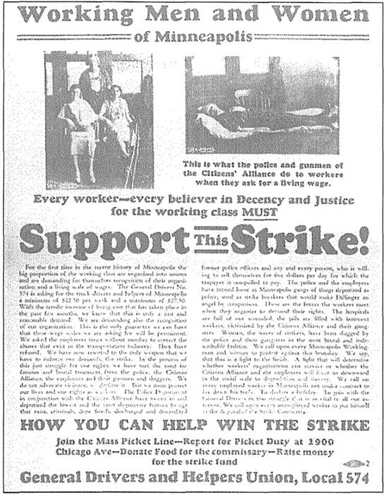 警察的暴行激怒了全城的工会活动家;而574分会的英勇斗争又让他们大受鼓舞。建筑业的工人群情激奋,他们要求举行罢工,这不是为了狭隘的行业利益,而是为了与苦战中的卡车司机并肩战斗。建筑业工人群众的巨大压力,迫使建筑业工会委员会(Building Trades Council)的干部举行声援罢工。建筑业的行业工会一个接一个地通过决议:卡车司机罢工多久,他们就跟着停工多久。在两名共产主义者同盟党员老奥斯卡·库弗和切斯特·约翰森(Chester Johnson)的鼓舞下,建筑业的一个工会电力工人工会(库弗和约翰森也是这个工会的会员)还举行游行,前往罢工总部,接受574分会罢工委员会的指挥。虽然举行声援罢工的行业基本上只有建筑业,但劳联中央劳工联盟执行委员会经过表决后,还是决定给574分会提供财政支持和道义支持。