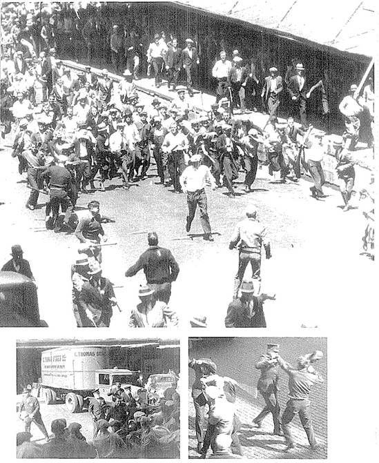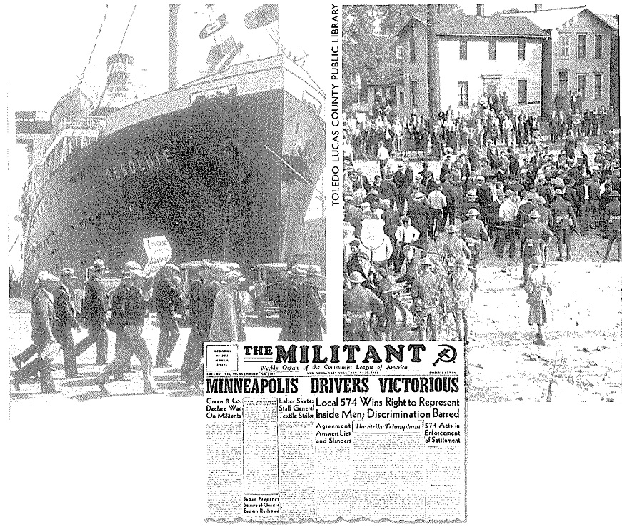 ![]() 纠察队员与警察战斗。 ![]() 1933年3月,农民在圣保罗市的明尼苏达州议会大楼前游行,要求政府提供援助,在1934年罢工中,农民成了工人的盟友。 ![]() 1934年4月6日,由于联邦政府提供的“救济”过少,甚至达不到贫困线,一万名失业工人在明尼阿波利斯游行抗议。警察随后用催泪弹驱散了游行队伍。 ![]() 1932年7月,15000名失业的一战退伍军人在华盛顿国会大厦附近扎营,要求获得他们应得的退役金。道格拉斯·麦克阿瑟将军出动骑兵和坦克镇压,导致两人死亡,多人受伤。 ![]() 1932年3月,3000名失业工人在福特汽车公司红河工厂举行游行,遭到警察镇压,导致5人死亡,60人受伤。 ![]() 1932年2月,日帝侵略上海,残暴的日寇焚毁了工人区,而富人居住的租界却被美军保卫着,毫发未损。奥马哈的报纸上刊登的这类照片,使法雷尔·多布斯理解了阶级之间是不平等的,明白了世界资本主义体系的野蛮是令人无法忍受的。 ![]() ![]() 以上两张图是“治安队狼狈逃窜之战”(Battle of Deputies Run):1934年5月21—22日,几百名工人在明尼阿波利斯市场区包围了警察和治安队(公民联盟收买的打手),把他们打得屁滚尿流。 ![]() “血腥星期五”惨案:1934年7月20日,警察向手无寸铁的纠察队员开枪,导致67名纠察队员和路人受伤,其中两名罢工工人因伤重身亡(亨利·内斯于7月22日逝世,约翰·贝洛于8月1日逝世)。 ![]() 1934年7月24日,四万多人为亨利·内斯送葬。 ![]() 为了纪念亨利·内斯,同志们在574分会罢工总部入口上挂上了花圈和牌匾,牌匾上刻着他的遗言:“告诉小伙子们,别让我失望。” ![]() 奥尔森州长(左)和联邦调解员弗兰西斯·哈斯神父(中)与尤金·邓尼根(右)。他们相互勾结,想把“公平”的罢工协议推销给工人。 ![]() 7月26日,奥尔森出动四千国民警卫队,在明尼阿波利斯实施戒严。图为奥尔森的军队保护工贼卸货。 ![]() 8月1日,国民警卫队士兵端着上了刺刀的步枪,查抄了劳联总部。 ![]() 上图:8月1日,国民警卫队查封了574分会罢工总部,抓走了雷·邓恩;下图:格兰特·邓恩(左一)与574分会律师阿尔伯特·戈尔德曼(右一)迎接比尔·布朗(戴白帽者)、迈尔斯·邓恩和雷·邓恩出狱。 ![]() 纠察队员检查卡车司机是否持有工会发放的通行证。 ![]() 8月1日,就在国民警卫队查封工会总部、逮捕罢工领袖之后,仅仅过了几个钟头,国民警卫队就接到了工贼打来的500多个求救电话。图为被掀翻的工贼卡车。 ![]() 纠察队总调度员凯利·波斯特尔。 ![]() 罢工期间,为了团结农民,574分会特地租了一个停车场,让农民在这个停车场里卖菜,而且不收摊位费。 ![]() 罢工工人在工会食堂里打饭。这个食堂是由妇女后援会运营的。 ![]() 上图:574分会的罢工领袖,左起:比尔·布朗、法雷尔·多布斯和卡尔·斯科格伦德;中图:邓恩三兄弟,左起:雷、格兰特和迈尔斯;下图:马克斯·沙赫特曼(左)与詹姆斯·坎农(右)。 ![]() 上图:1934年纺织工人总罢工期间的乔治亚州格林斯伯罗市纺织工人纠察队,在大西洋沿岸有四十万人参加了这次罢工。罗斯福派出四万军队镇压罢工,导致16人死亡,数百人受伤。 下图:1936年,纽约哈莱姆区的工人为了改善生活条件而举行罢工。 ![]() 左图:西海岸码头装卸工人坚持罢工三个月,迫使资方承认工会、增加工资并减少劳动时间;中图:1934年8月25日的《战士报》头版刊登了明尼阿波利斯卡车司机罢工胜利的消息;右图:俄亥俄州托莱多市的汽车配件工人举行罢工,战胜了老板。在这次罢工期间,发生了长达六天的巷战,史称切斯特纳特山之战(Battle of Chestnut),这张照片就是当时拍摄的。 ![]() 1936年12月,密歇根州弗林特市的通用汽车工人举行静坐罢工,次年2月,罢工赢得胜利。 ![]() 1937年元旦,罢工中的底特律汽车工人举行示威游行。 ![]() 密歇根工人抗议共和钢铁公司枪杀芝加哥工人。 ![]() 卡车司机总工会内布拉斯加州奥马哈市第554分会的领导人首次进行纠察。左起:迪克·索登贝格(Dick Sodenberg)、路易斯·米勒(Louis Miller)与马尔科姆·拉夫(Malcolm Love)。 ![]() ![]() 明尼阿波利斯—圣保罗地区的工会会员成立了工会自卫团(Union Defense Guard),抵挡老板豢养的法西斯分子和其它反动派。 ![]() 工会自卫团总团长、544分会会员雷·雷因波尔特。 ![]() 1939年,明尼阿波利斯公共事业振兴署下水道工程项目工人举行罢工。 ![]() 1939年8月,蒙冤入狱长达23年之久的加利福尼亚工会组织者汤姆·穆尼(Tom Mooney)访问明尼阿波利斯,在工人大会上发表讲话。 ![]() 左图:1937年12月,由于日军轰炸了中国境内的美国炮艇,美国国内掀起了出兵的喧嚣声,在这一片喧嚣声中,明尼阿波利斯卡车司机联合委员会的周报《西北组织者》指出,美国大公司正在残酷剥削中国劳动者。“他们说的‘我们’到底是谁?凭什么叫我们出钱出人去保护身在中国的‘他们’?让美军全部撤离中国!”;右图:1940年1月,多布斯辞去国际卡车司机兄弟会总组织者的职务,前往纽约担任社会主义工人党的工人与组织书记途中,前往墨西哥拜访了托洛茨基同志。 ![]() 1941年,罗斯福政府为了进行战争动员、镇压阶级斗争,动用臭名昭著的《史密斯法案》(Smith Act),起诉了544分会和社会主义工人党的18位领导人。下图:1943年12月,多布斯(中间者)和另外17人被指控犯有“煽动暴乱”的罪名,这张照片是在他们被押往联邦监狱的途中拍摄的。多布斯右边是党的领袖卡尔·斯科格伦德、阿尔