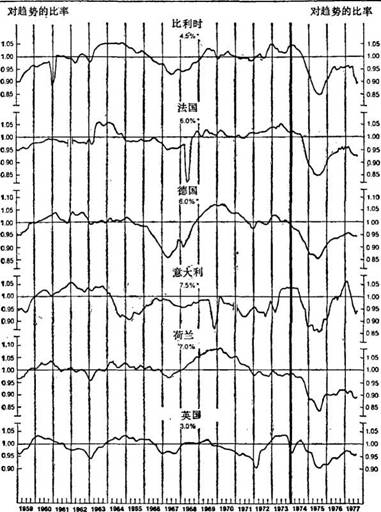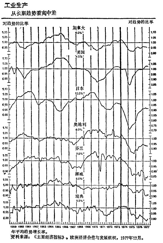本文援引的这套图表是由经济合作与发展组织(OECD)绘制的(见第20页到第21页)。这个以巴黎为基地的俱乐部,几乎囊括了中心地区的所有国家。在我看来,这套图表生动地反映了各先进工业国家的状况,颇为有用。我的演讲就从这套图表开始。全部图表涉及各个不同的国家,并都是在相同的基础上编制而成的。1.00处的横线分别表示第二次世界大战以后各国工业生产的平均增长率(法国为6%,美国为4.5%,英国为3%,等等)。高于或低于这道横线的偏差表示增长较快或较慢的年份。根据“正常的”预期,衰退阶段的增长率理所当然地应低于平均水平,回升阶段的增长率应高于平均水平。图表所示的1974年以前各个年份的情况也的确如此。
