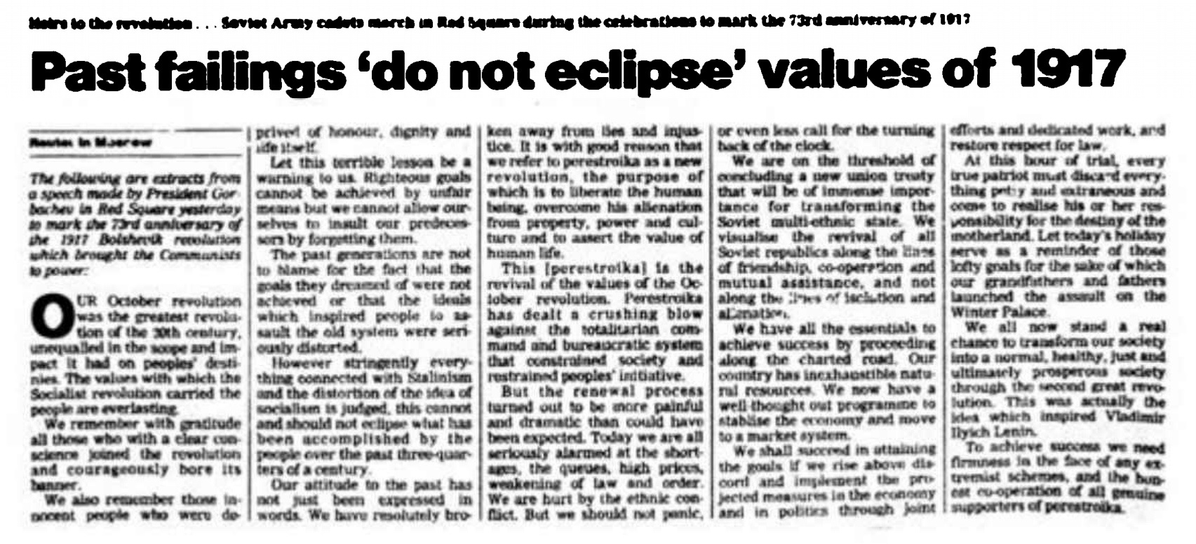 有客在家,影响了我的正常生活,好多天没有写札记。本月7号是十月革命的第七十五周年纪念日,发生在莫斯科的种种,引起了我无限感慨。本来有许多话想说,只因生活打乱了,头晕脑胀,什么都不能做。我曾经把戈巴乔夫比作俄皇亚历山大二世,把他的改革比作当年那位沙皇的解放农奴。从最近苏联的情形看,这个比拟好像是可以成立的。如果红场上那天发射的子弹打中了戈巴乔夫,那末这个历史模拟竟连细节都相同了。
